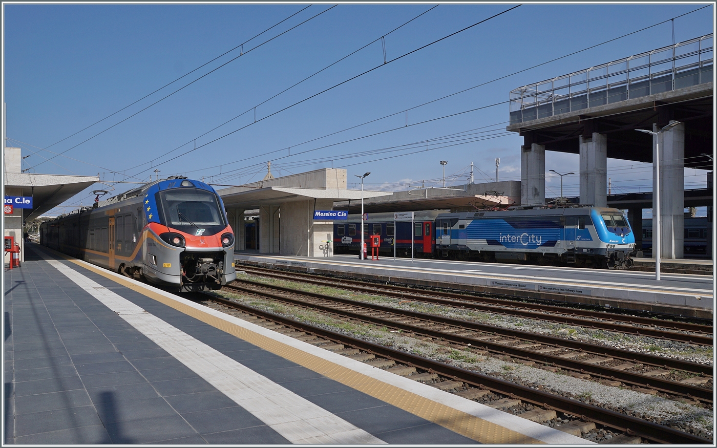 In Messina Centrae wird der FS Trenitalia ETR 104 053 als Regionalzug 12977 nach Catania Aeroporto Fontanarossa bereitgestellt, während im Hintergrund die FS Trenitalia 464 292 mit dem Nachtzug 1963 von Milano Centrale nach Siracusa auf die Abfahrt wartet.