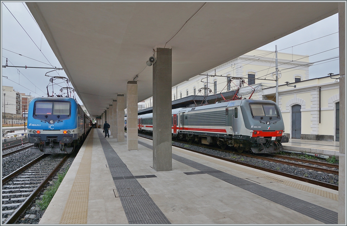 Während in Siracusa links im Bild die FS Trenitalia E 464.311 (und eine weiteren Lok an der Zugsspitze) mit ihrem Nachtzug aus Roma Termini ihr Ziel erreicht haben, stellt rechts im Bild die FS Trenitalia E 464 191 ihren iC 724 nach Roma bereit.