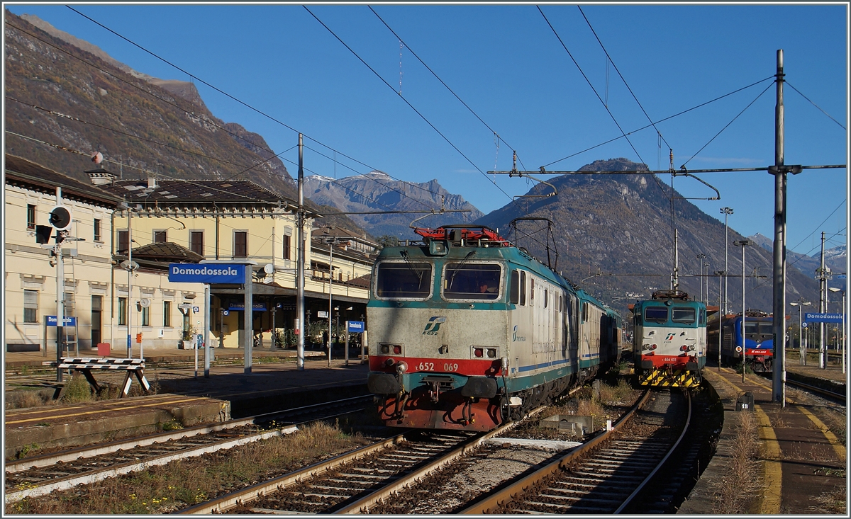 Mittwoch den 28.10.2009 um 13:34 Uhr in Domodossola (I). Italienische Lok in Domodossola (I). Es handelt sich hier um eine FS E-Lok (E656.515). Spitzname für diesen Loktyp: Caimano (deutsch: Kaiman), UIC-Nr. 91 83 2656 515-0 I-TI, Baujahr: 1987, Heutiger Betreiber/Besitzer: Trenitalia S.p.A., Depot: Palermo, Achsformel: Bo'Bo'Bo', Sromsystem: 3'000 Volt = (Gleichstrom), Höchstgeschwindigkeit: 150 km/h, Baujahr: 1987. Diese Lok stammt aus der 5. Bauserie. Koordinaten GMS (Grad, Minuten, Sekunden): N 46° 6’ 52.3’’ O 8° 17’ 48.2’’