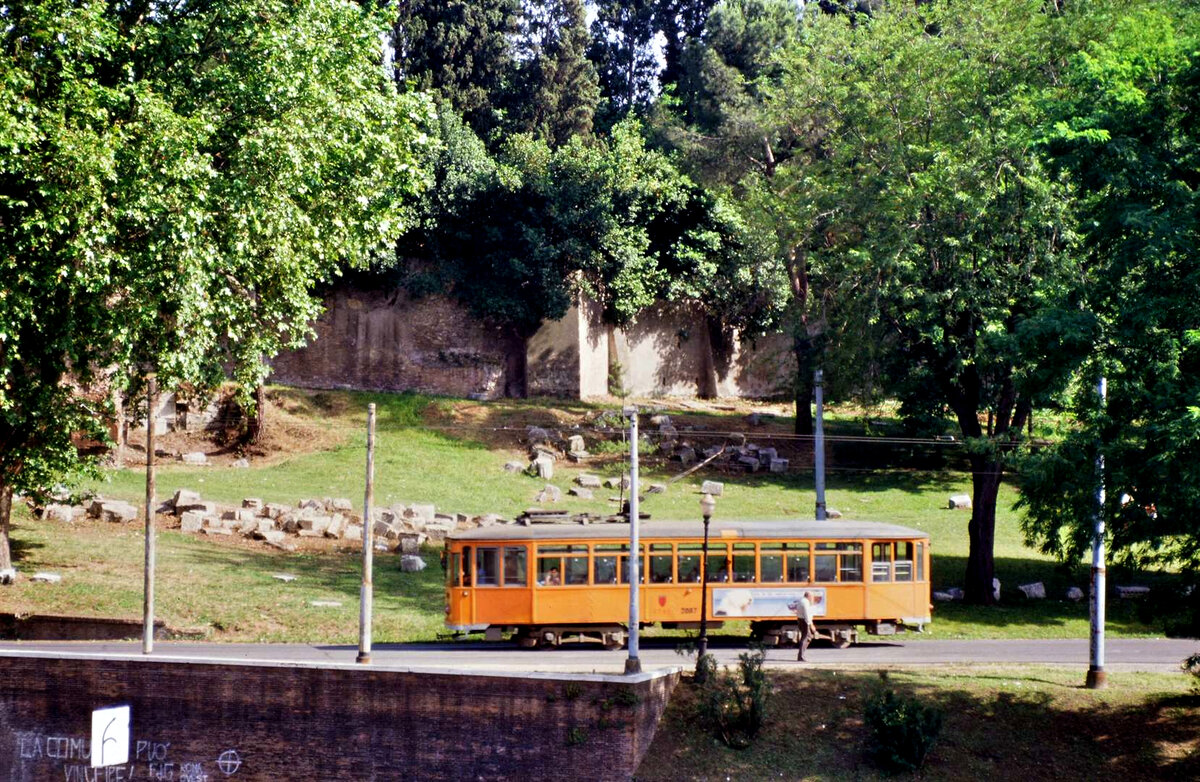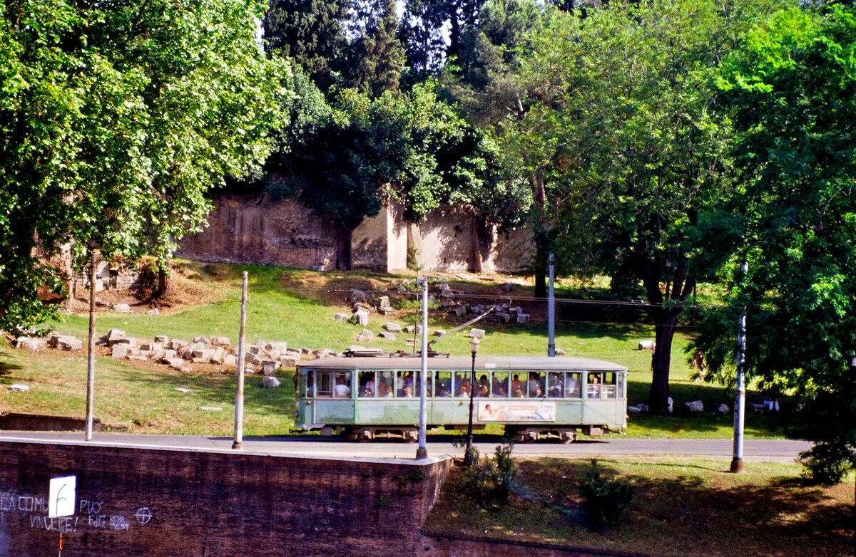 Roma / Rom ATAC Linea tranviaria / SL 13 (MRS 2201) Via di San Gregorio / Piazza di Porta Capena / Via dei Cerchi / Circo Massimo am 23. August 1970. - Hinter der Straßenbahn sieht man einen kleinen Teil des palatinischen Hügels, des antiken Palatinus Mons. - Scan eines Farbnegativs. Film: Kodak Kodacolor X.