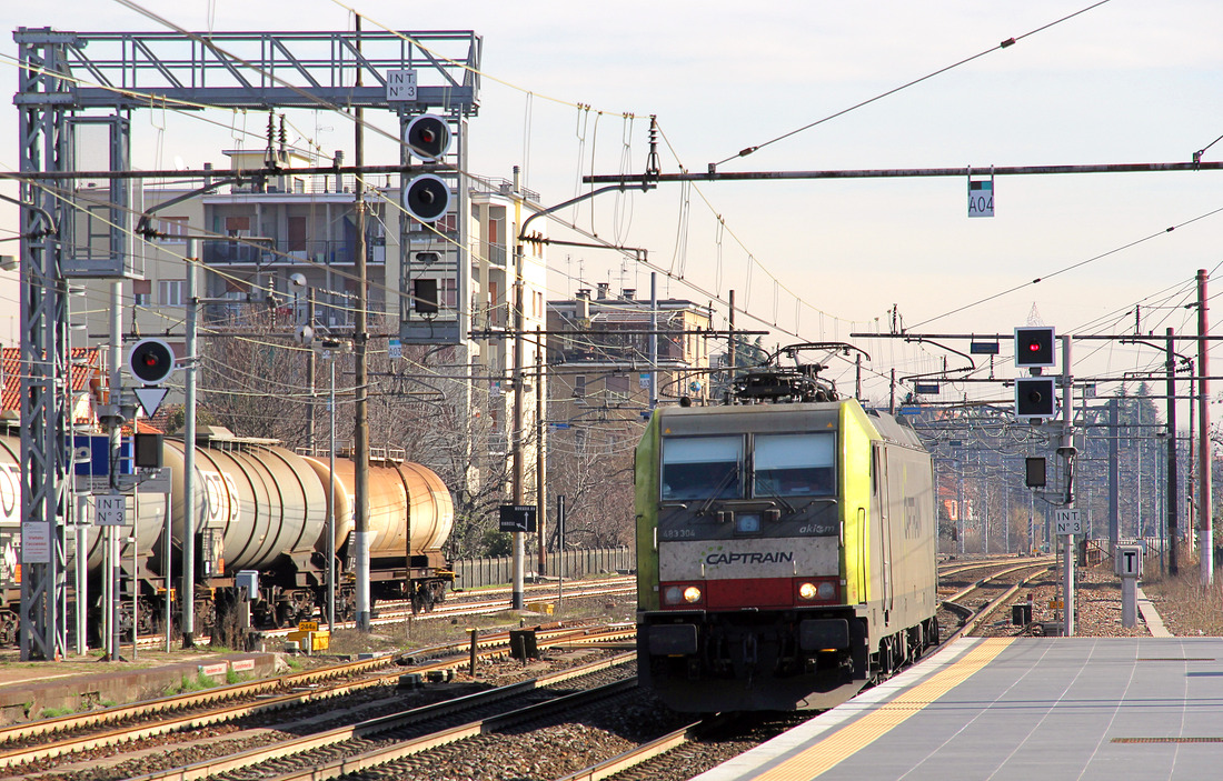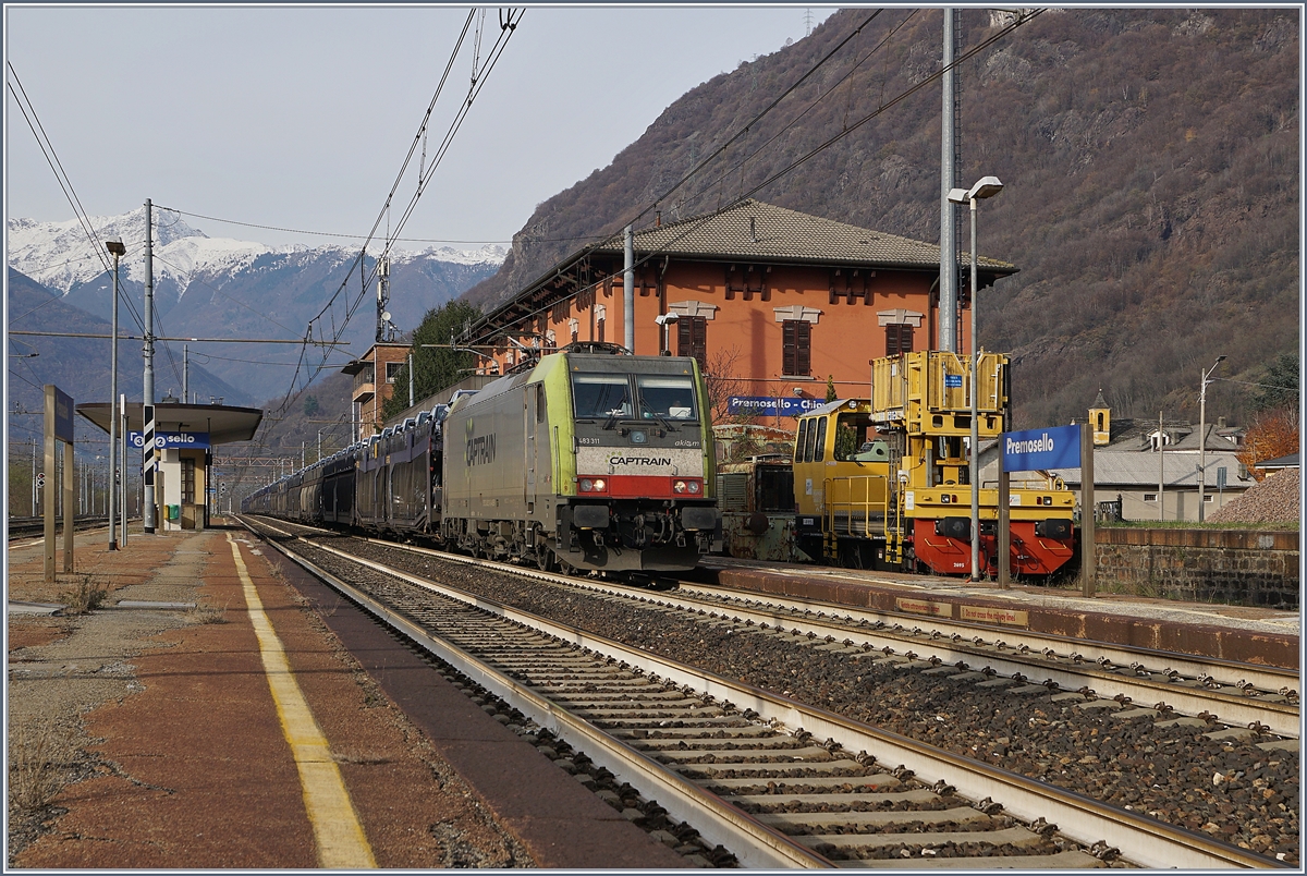 Die CAPTRAIN E 483 311 (UIC 91 83 2483 311-3 I-AKIEM) fährt mit einem langen Blockzug für Neuwagen durch den Bahnhof von Premosello Chiavenda Richtung Süden.