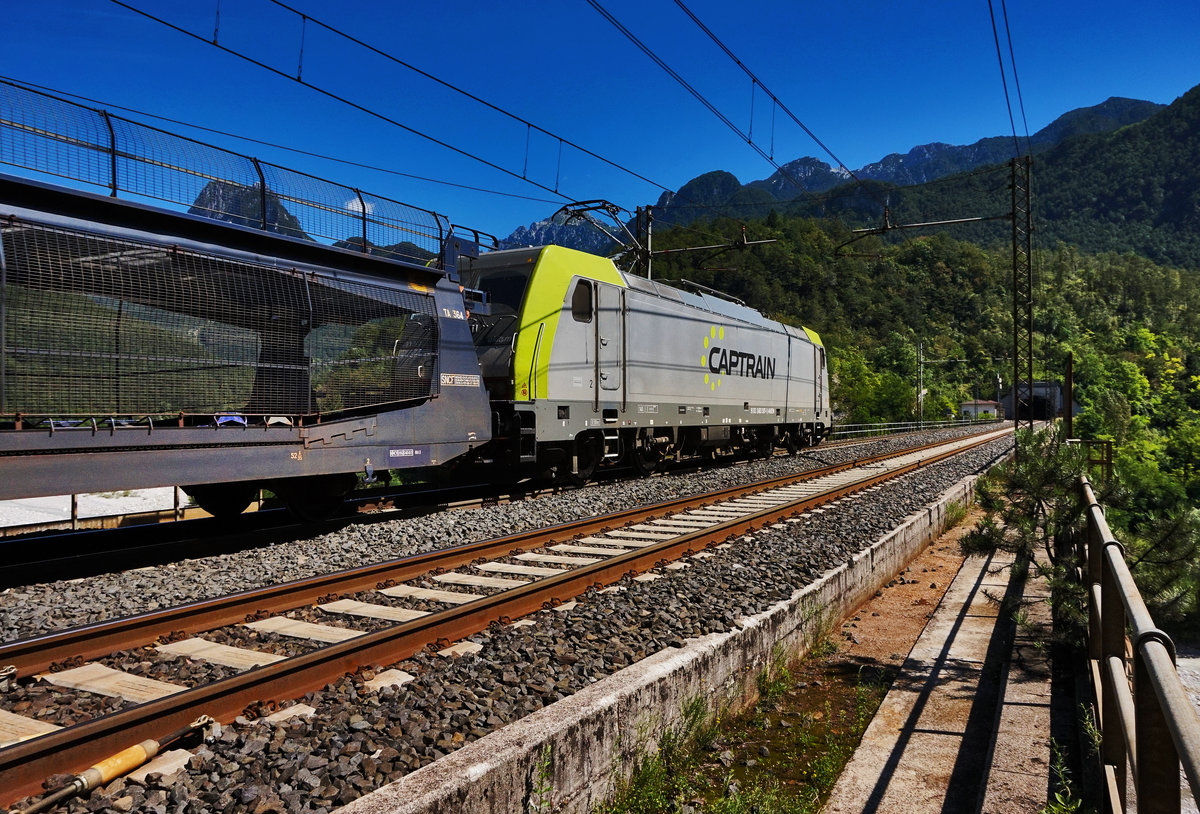 Nachschuss der CAPTAIN (akiem) E 483 307-1, diese mit ihrem leeren Autozug nach Tarvisio Boscoverde, die Val-Aupa-Brücke, oberhalb der Ortschaft Moggio überquert.