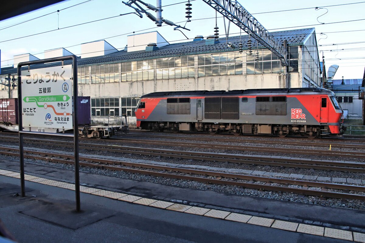 JR Freight (JRF) Dieselelektrische Lok DF 200: Für den schweren Güterverkehr (Containerzüge) auf der Nordinsel Hokkaidô gebaut. DF200-901 Prototyp im Jahr 1992, DF200-1 bis 12: 1994-1998, DF200-51 bis 63: 1999-2004 (Nr. 56 ausgeschieden), DF200-101 bis 123: 2005-2011. Mehrere Loks seit 2016 umgebaut, mit starkem Lärmschutz versehen und von Hokkaidô in den Raum Nagoya versetzt (neue Nummern 200 statt 100, also 223 statt 123). Für einen Luxuszug auf der Südinsel Kyûshû kam noch eine weitere Lok 2013 (DF200-7000) in Betrieb. Diese Loks haben die bisherigen DD51 vollständig ersetzt. Im Bild links DF200-55, rechts DF200-119 in Obihiro in der Mitte von Hokkaidô. 27.Oktober 2022