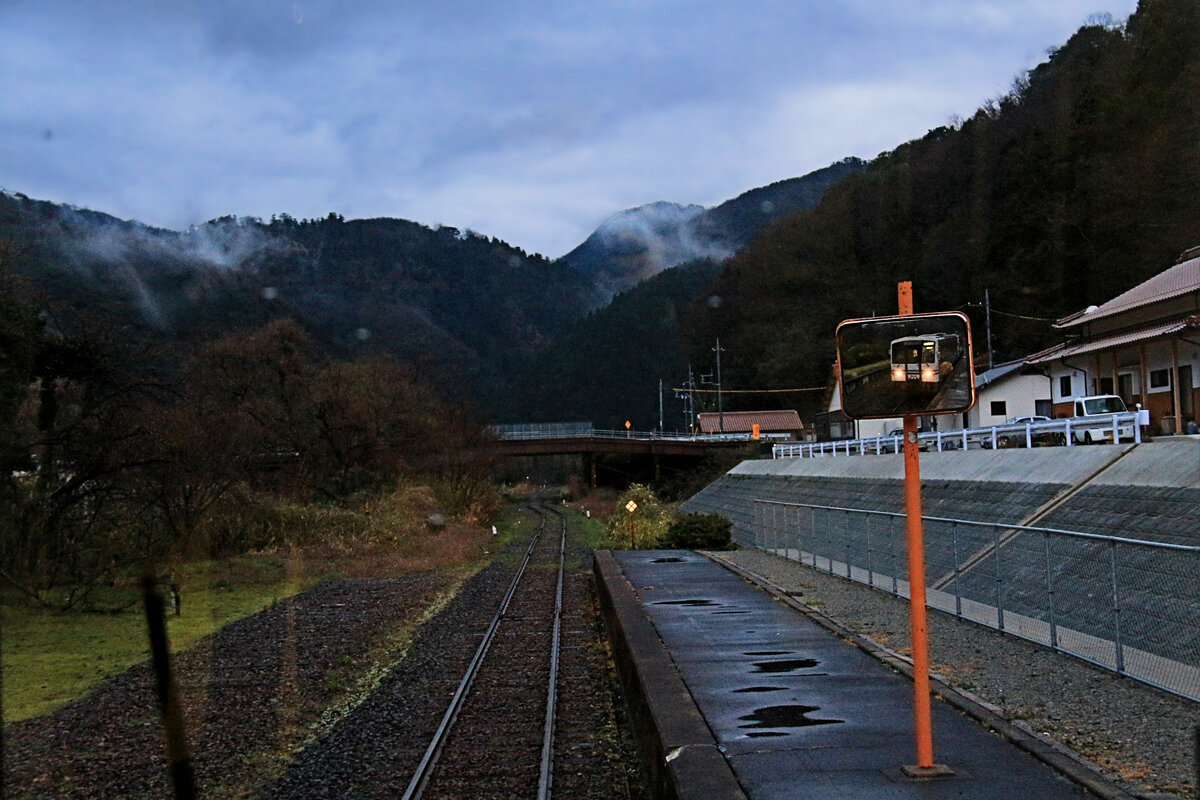 Die heute stillgelegte Sankô-Linie: Am Morgen des 27.März 2017 fährt Schienenbus KIHA 120-317 in Hamahara ein. Die leichte Verzerrung des Bildes ist wegen der nassen Frontscheibe.