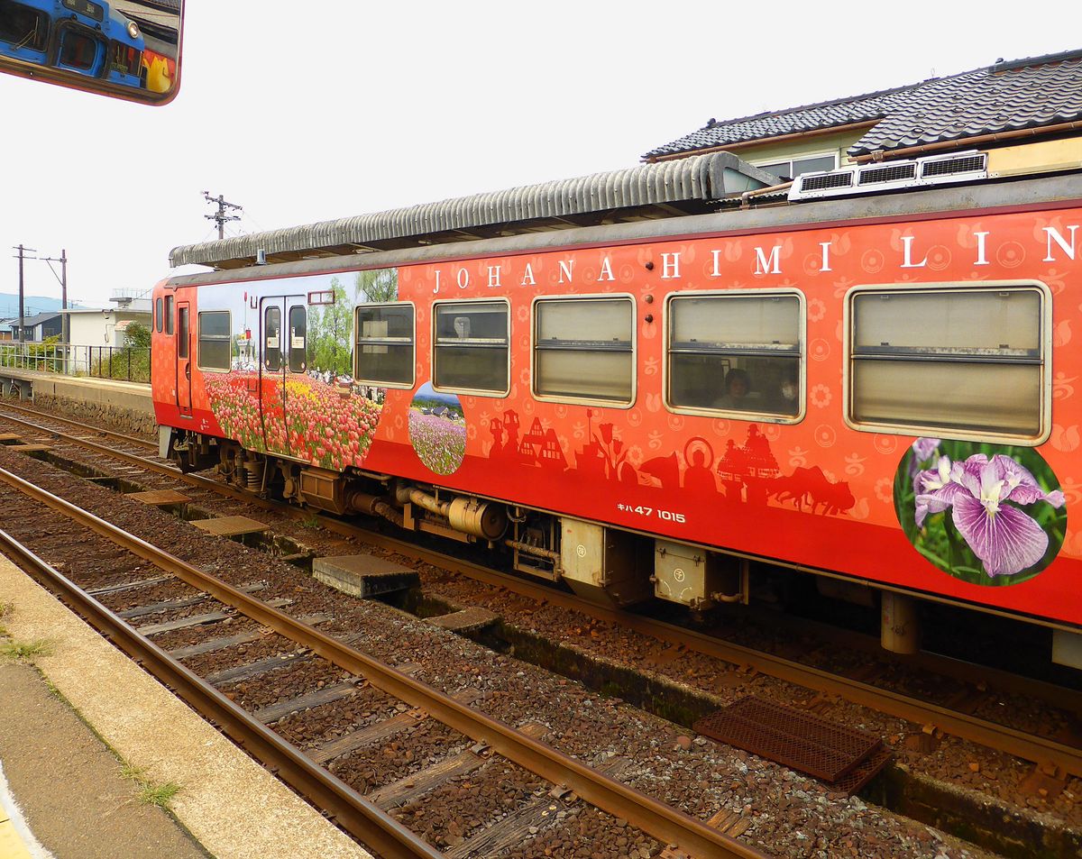 Triebwagen KIHA 47 3501 vermittelt noch die schlichte Atmosphäre der alten Staatsbahn, bereit für viele und auch stehende Passagiere. Die Sitzgruppen und Längsbänke sind einfach und eher unbequem. Neben den Türen stehen die kleinen Ausgabekästen für die Zettel, auf denen jeweils die Nummer des Einsteigeorts steht; wenn der Zug einmännig geführt wird, wirft man beim Aussteigen das Fahrgeld zusammen mit dem kleinen Zettel unter den Augen des Wagenführers in den Kasten - eine Leuchttafel zeigt an, wieviel die Fahrt je nach Nummer auf dem Zettel kostet. Selbstverständlich kann man im Kasten auch Geld wechseln. Die KIHA 47 gehören zu den wenigen Wagen, wo sich die Fenster noch öffnen lassen; bei neueren Wagen ist es völlig unmöglich, Aufnahmen ohne störende Spiegelungen (und damit auch Ablehnung durch den Admin.!) zu machen. 26.März 2017.