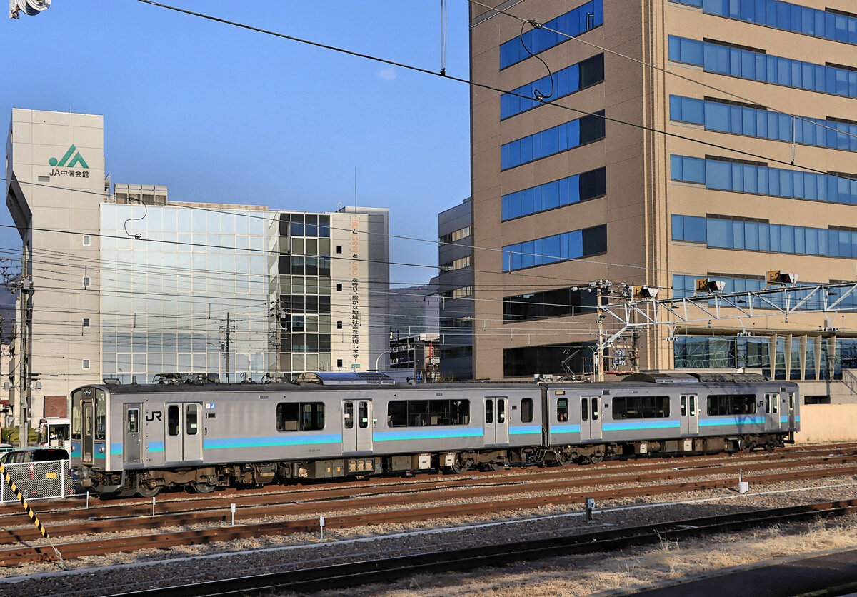 Serie 127 (E127), die hauptsächlichen Züge für den Betrieb in den zentralen Alpen. Der Typennummer wird ein E vorangestellt zur Kennzeichnung, dass der Wagen Eigentum von JR East Japan ist. Gleichstrom, 1995-1998 gebaut, 13 dieser Züge für den Bezirk Niigata (nur mit Längssitzen), 12 Züge für das Hochland von Matsumoto, die alle noch im Dienst sind. Im Bezirk Niigata schied 1 Zug nach Unfall aus, 10 wurden an eine Privatbahn verkauft, und die letzten 2 schieden 2022 aus. Die beiden Wagen werden bezeichnet als KUMOHA E127 (KU = mit Führerstand, MO = motorisiert, HA = gewöhnlicher Sitzwagen), und KUHA 126. Die meisten KUHA 126 tragen einen speziellen Enteisungsbügel (im Bild sichtbar). Im Bild steht Zug E127-111 in der Bergstadt Matsumoto, 10.April 2022 Peter Ackermann