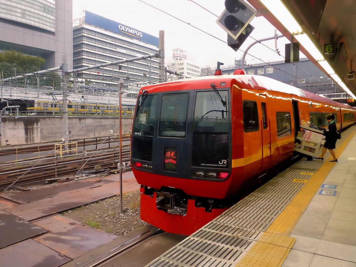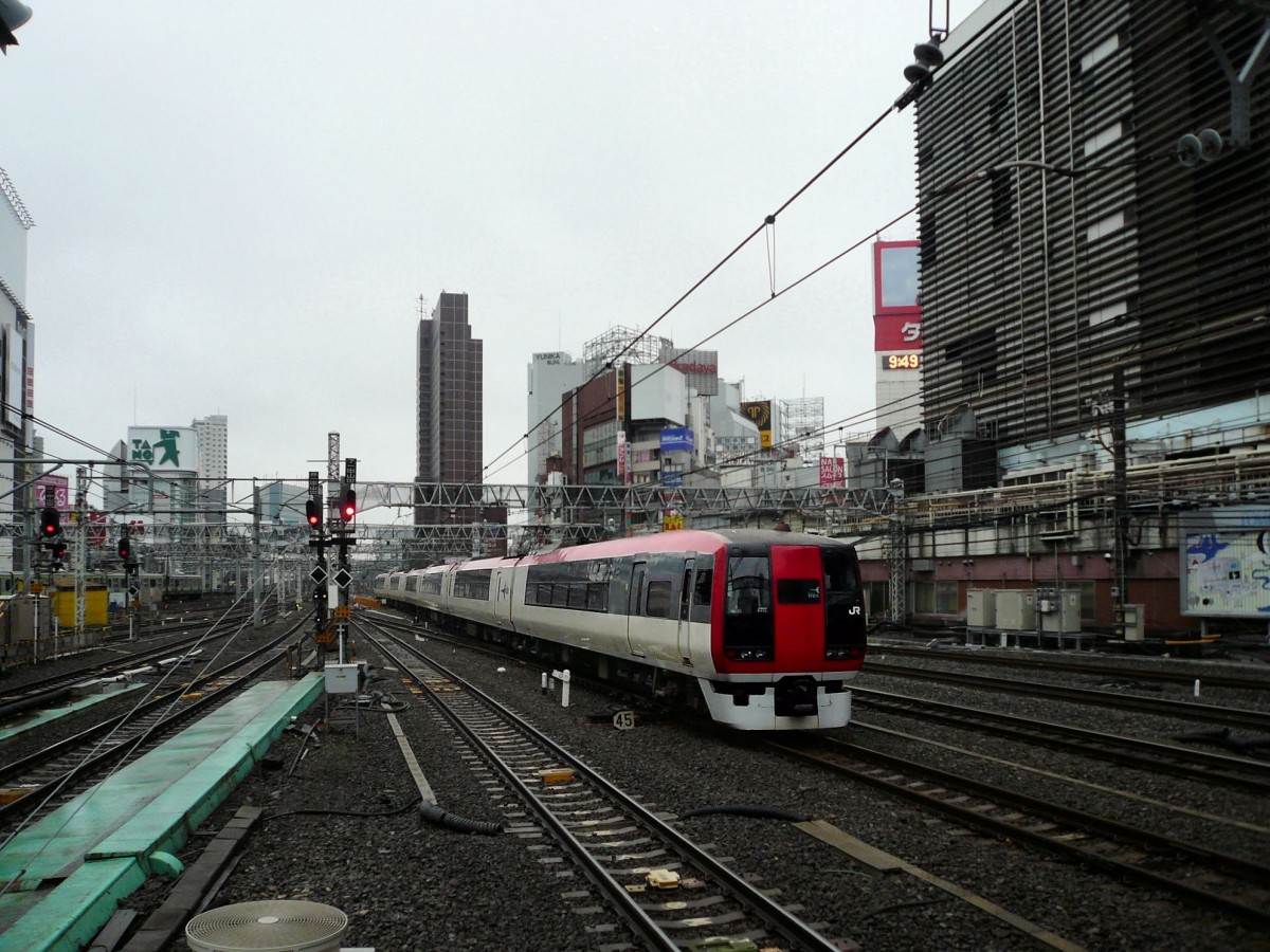 Serie 253: Am selben Ort (Tokyo-Shinjuku) wie das Bild vom 27.Februar 2010, jetzt am 10.Oktober 2011: Der ehemalige Narita-Express ist nun orange-rot gestrichen und führt seine Fahrgäste von Tokyo zu den berühmten Bergtempeln in Nikkô. Im Bild die vorderen Wagen des Zuges 253-1002.