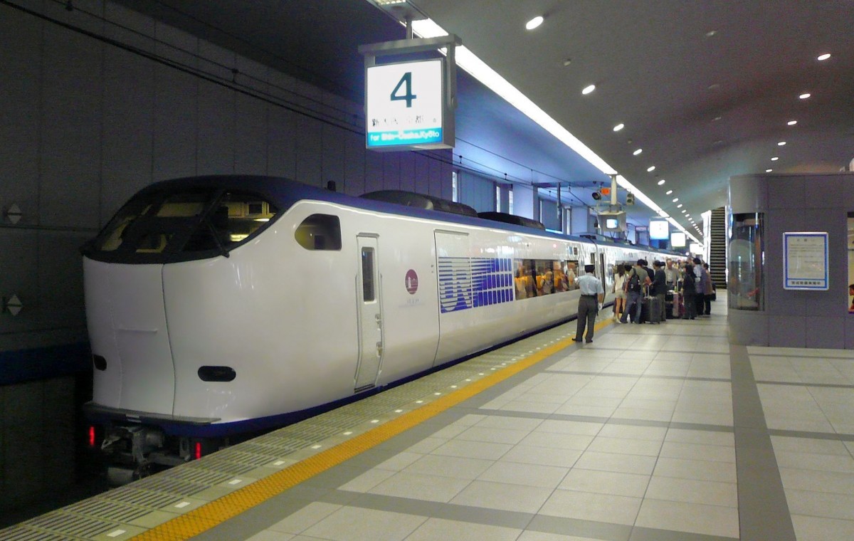 Serie 281: In den ersten Sonnenstrahlen des frühen Morgens kommt ein Zug über die grosse Brücke, die in ihrer Fortsetzung aufs Meer hinaus und zum Flughafen Kansai führt. 8.Dezember 2010.