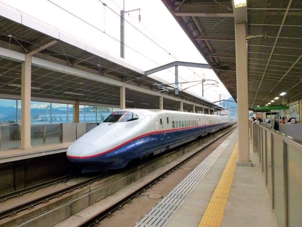 Shinkansen Serie E2. Zwischen 1997 und 2005 gebaut, heute 14 8-Wagen- und 33 10-Wagen-Züge. Die 10-Wagen-Züge sind heute der Tôhoku-Shinkansenlinie in den Norden zugeteilt. Bis Morioka fahren sie mit 275km/h, danach mit 260km/h. Zum Typ E2 gehören die E223 und E224 Frontwagen,E225 und E226 Zwischenwagen (E226 mit Pantograph),und E215 mit Luxussitzen ("Green Car").Im Bild steht E224-1110 in Hachinohe, 30.August 2008.