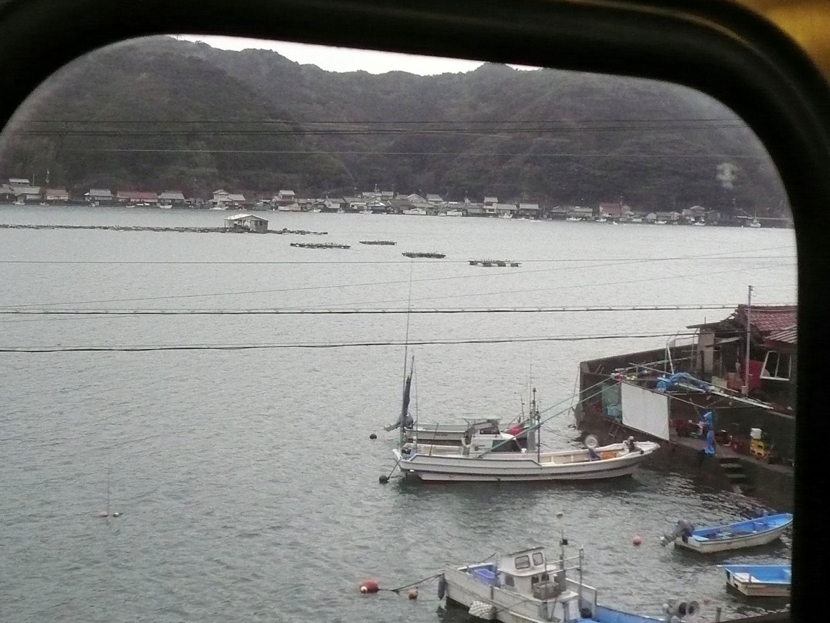 Im Triebwagen KUMOHA 105-501 in den wilden Süden der Kii Halbinsel: Lauter etwas finstere Buchten mit kleinen Fischersiedlungen entlang der Strecke, hier bei Kii Uragami, 24.Februar 2009. Peter Ackermann