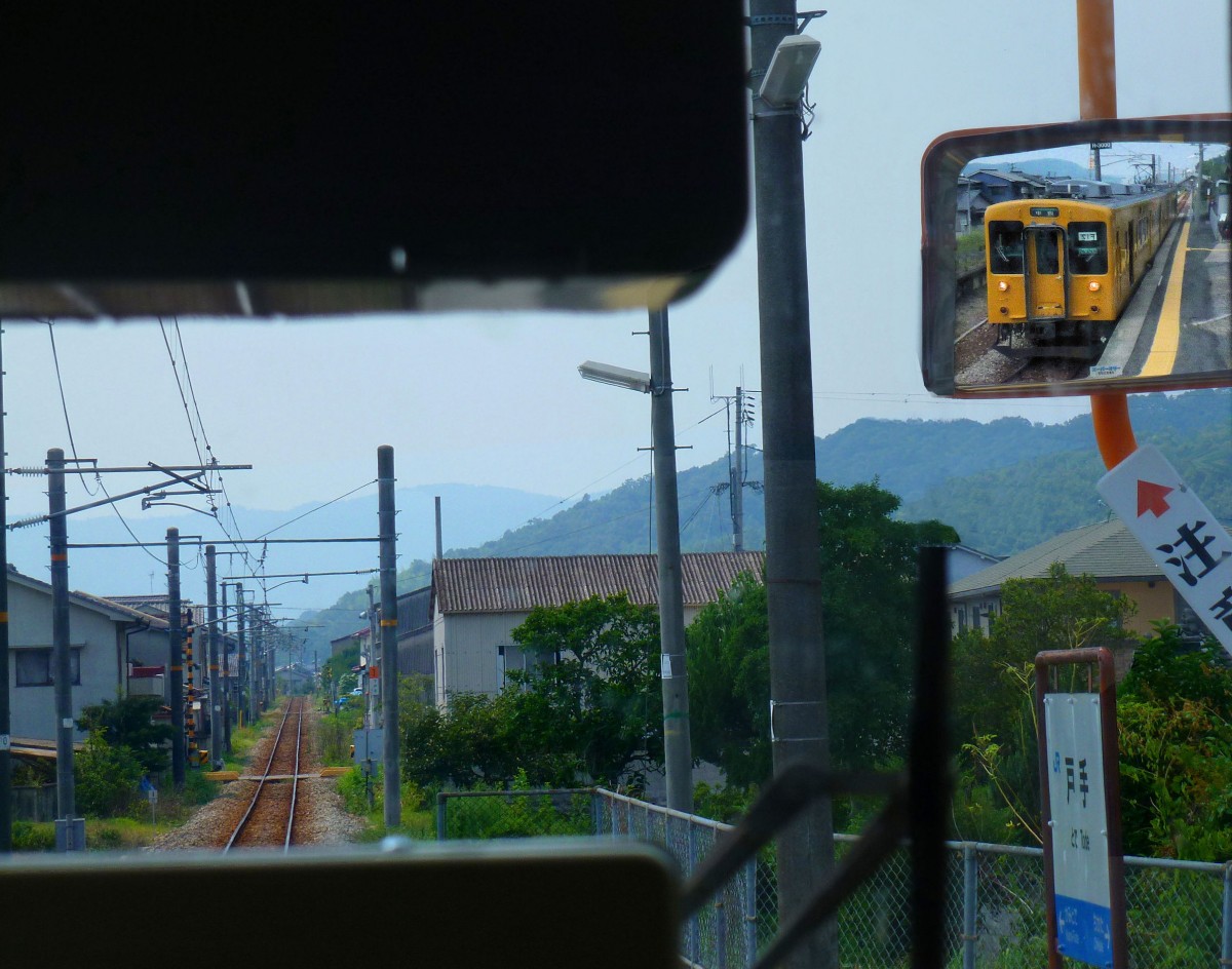 Serie 105 im Hinterland von Fukuyama: Ein Bild der Strecke aufzunehmen ist durch das verglaste Führerstandrückfenster und die verschiedenen Anzeigetafeln im Frontfenster hindurch schwierig. Hier steht Steuerwagen KUHA 104-26 des Zuges KUMOHA 105-31 am Zwischenhalt in Tode. 13.August 2013. Peter Ackermann