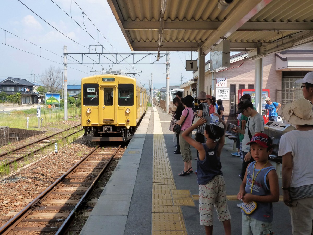 Serie 105 im Hinterland von Fukuyama: Nach Ankunft des Zuges 105-31 im ziemlich einsamen und verlassenen Fuchû gönnt sich das Personal einen Schwatz. 13.August 2013.