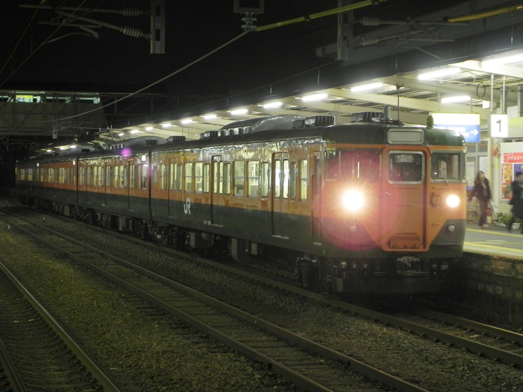 Serie 111 u.113 - mit dem Zug zum Kashima Schrein: Steuerwagen KUHA 111-1066 am Schluss eines Vierwagenzugs am Bahnhof des Kashima Schreins (Kashima Jingû), 26.November 2009.