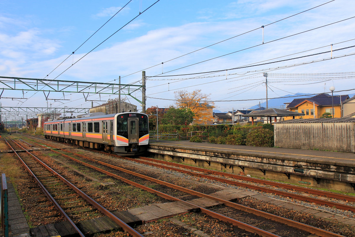 Serie 115 - die Bahn am heiligen Berg Yahikosan: Zweiwagenzug der Yahiko-Linie (KUMOHA 114-504 und KUMOHA 115-504, beide Wagen motorisiert) in Yoshida, 17.Oktober 2011.