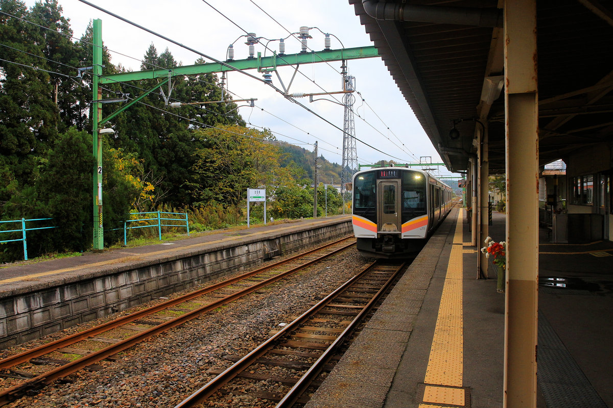 Serie 115 - die Bahn am heiligen Berg Yahikosan: Der 634m hohe Yahikosan steigt von Osten gesehen unvermittelt aus der Ebene, nach Westen fällt er steil ab direkt ins Japanische Meer. Der Berg gilt selbst als Gottheit; er schenkt Schatten, Schutz und frisches Quellwasser. Blick von Osten auf den Yahikosan aus einem Regionalzug Serie 115, in der Nähe von Maki unterwegs nach Niigata, 17.Oktober 2011.