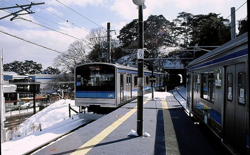 Serie 205-3000: Wenn S-Bahnzüge durch neuere Fahrzeuge ersetzt werden, kommen sie meist auf ländliche Strecken (oder neuerdings etwa auch nach Indonesien). Einige Züge Serie 205 (ab 1985 gebaut) aus Tokyo kamen nach Umbau (2002-2004) als 205-3000 in die Region Sendai. Hier fährt ein Zug mit Steuerwagen KUHA 205-3114 im verschneiten Matsushima Kaigan an der Pazifikküste aus der Station aus; 5.März 2005. Peter Ackermann