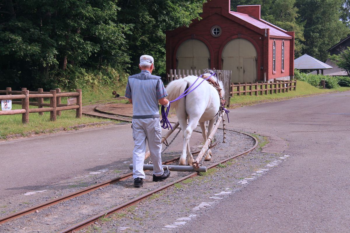 Die Pferdebahn des Freilichtmuseums von Hokkaidô bei Sapporo: Ein Zug in voller Fahrt in der Hauptstrasse, 31.Juli 2016.