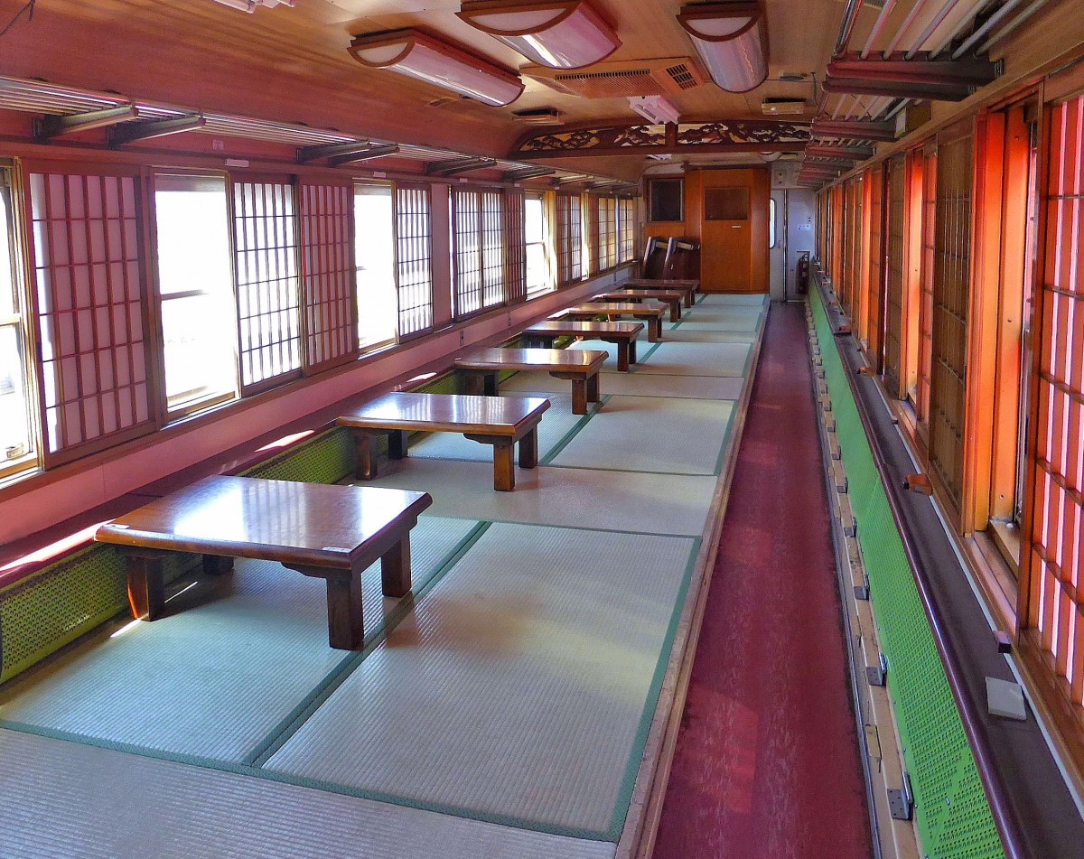 Wagen mit japanischem Innenraum: Seit langer Zeit werden in Japan Sonderzüge angeboten, die aus Personenwagen oder elektrischen bzw. Dieseltriebwagen bestehen, deren Innenraum als traditionelles japanisches Zimmer eingerichtet ist. Blick in den Wagen SUROFU 12-822 (スロフ12-822)(SU=Personenwagen 37,5-42,5 t; RO=zuschlagspflichtig; FU=mit Personalabteil). 5.April 2014.