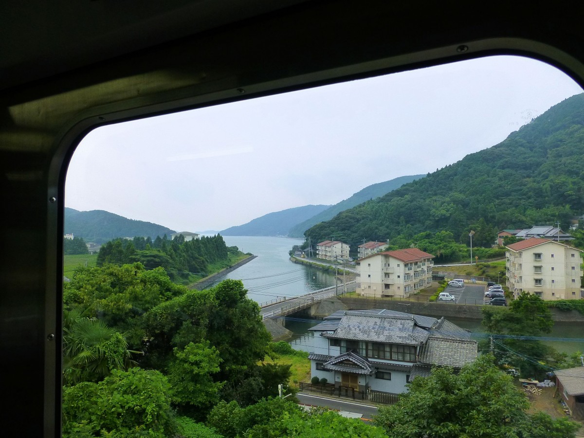 Matsu-ura-Bahn: Triebwagen 615 kreuzt in Kusuku mit seinen uralten Bäumen, 26.Juli 2013.