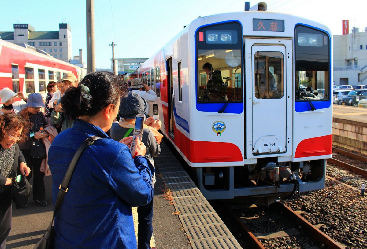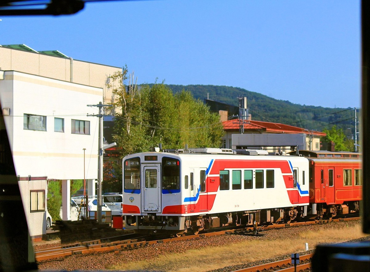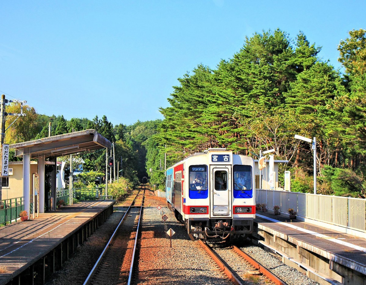 Grunddaten der Sanriku-Bahn (Nordabschnitt): Diese 71 km lange, weitgehend neu angelegte und kommunal betriebene Drittsektorbahn entstand 1984 zur touristischen Erschliessung der Sanriku-Küste im äussersten Nordosten der jap.Hauptinsel zwischen den Ortschaften Miyako und Kuji. Seit 1997 fahren einzelne Züge über Kuji hinaus auf der JR-Strecke bis zum Shinkansenbahnhof Hachinohe. Im Bild ein Dreiwagenzug in Noda Tamagawa mit Triebwagen 36-104 am Ende, 24.August 2008.