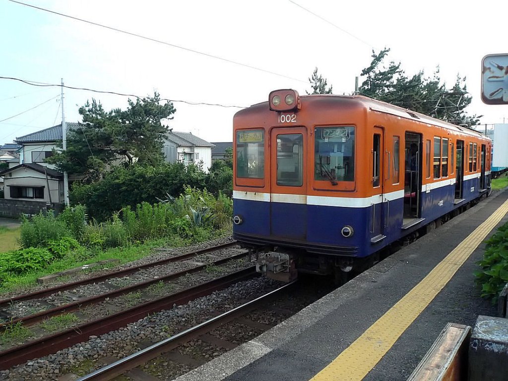 Grunddaten der Chôshi-Bahn (Chôshi Dentetsu, "elektr.Bahn von Chôshi"): Sie beginnt im Fischerhafen Chôshi an der Spitze der in den Pazifik ragenden Halbinsel direkt östlich von Tokyo und führt zum 6,4km entfernten Fischerdorf Tokawa. Sie ging 1998 und wieder 2006 pleite und konnte nach Veruntreuung von Geldern durch die alte Direktion sich nicht refinanzieren. Schliesslich brachte sie durch eine berühmt gewordene Verkaufsoffensive von schmackhaften rice crackers und einen Unterstützungsverein genug Geld zusammen für eine minimale Revision eines Wagens und der Anlagen. Im Bild ist ein Zug gerade in Chôshi eingetroffen, 1.Juli 2010.