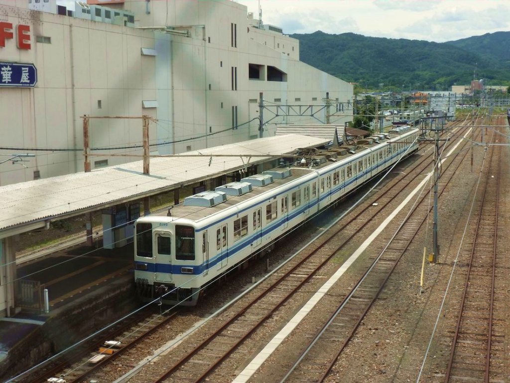 Tôbu Serie 8000, der klassische Tôbu-Lokalverkehrszug mit Längssitzen: Zuhinterst im Abstellgleis von Yorii steht der Vierwagenzug 8197. Von hier aus geht es mit anderen Bahngesellschaften weiter. 24.Juni 2011.