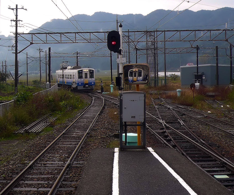 Echizen-Bahn: ältere Fahrzeuge mit einfachen Längssitzen werden zu Stosszeiten noch verwendet. Hier ist 2115, aus einer Serie mit noch 8 Wagen, die aus gebrauchten Elementen 1982 zusammengebaut wurden. Fukui, 4.November 2008.