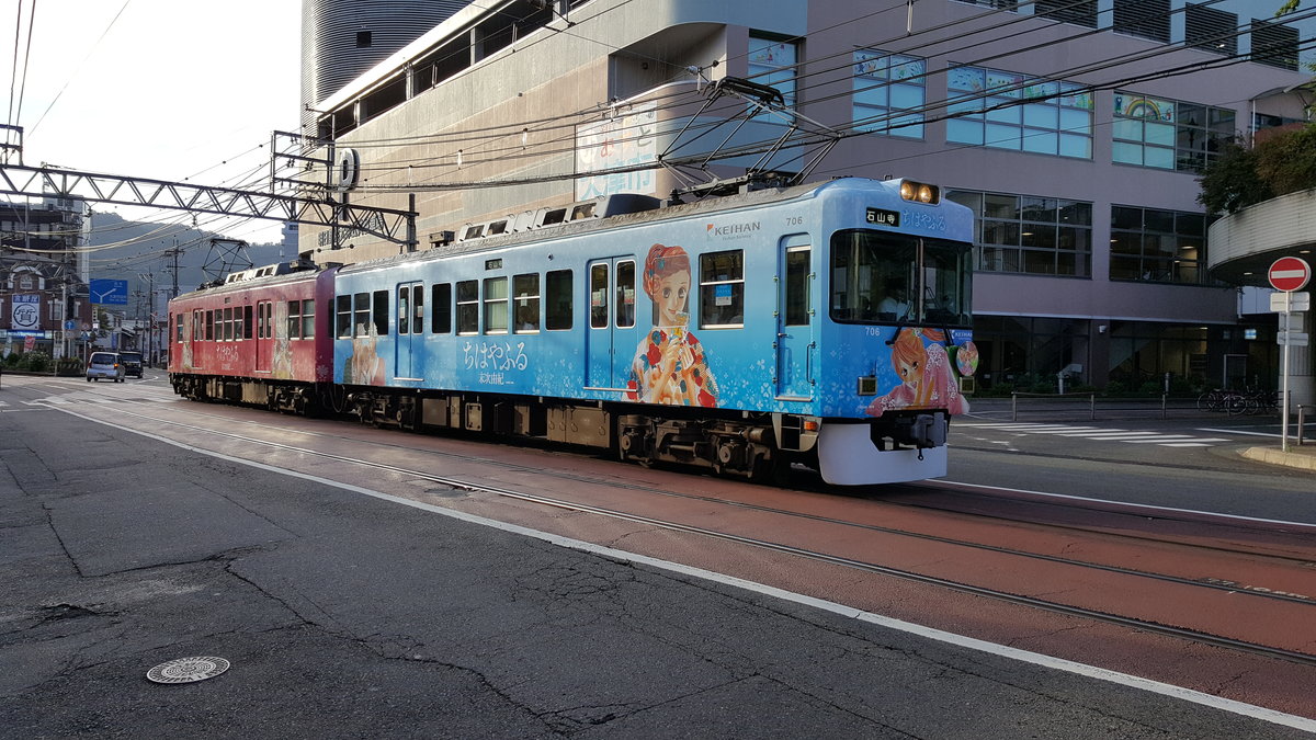 Der Zug wirbt hier für die Touristenattraktionen der Region, welche direkt an der Strecke der Keihan Ishiyama Sakamoto Line liegen: Berg Hiei-zan und der Biwa-See.