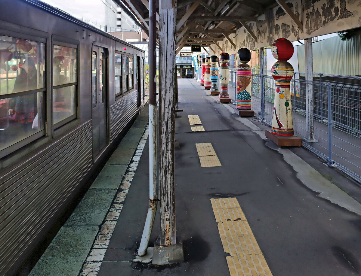 Ôwani-Linie, eine kleine Bahn vor dem Ende. Zug 7031-7032 in Ôwani, berühmt für seine heissen Quellen. Der Zug hat eine Aufmachung, die an Backsteinhallen (eine seltene Bauweise in Japan; heute Museum für Moderne Kunst) in Hirosaki erinnert. 11.November 2024