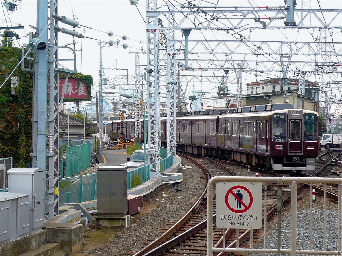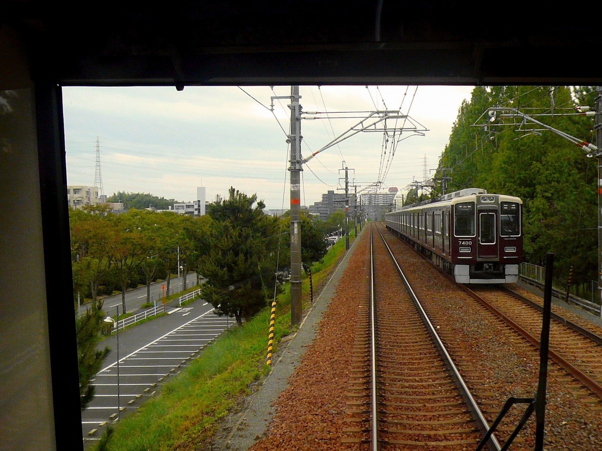 Der Hankyû-Konzern: Während in Ôsaka die Hankyû-Züge die U-Bahn (Sakaisuji-Linie) befahren, kommen umgekehrt U-Bahnzüge auf die Hankyû-Strecke. Im Bild verlässt links ein U-Bahnzug (66909) die Endstation der Stichlinie nach Kita Senri, während Hankyû-Zug 5323 einfährt. 28.September 2009.