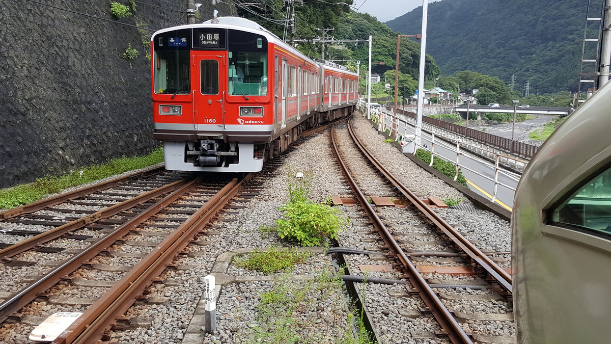 Odakyû Konzern serie 2000 "Not in Service" fährt am Bahnhof Gôtokuji vorbei. Die Züge auf der linken Seite sind die Serien 3000 und 60000. 19.05.2024