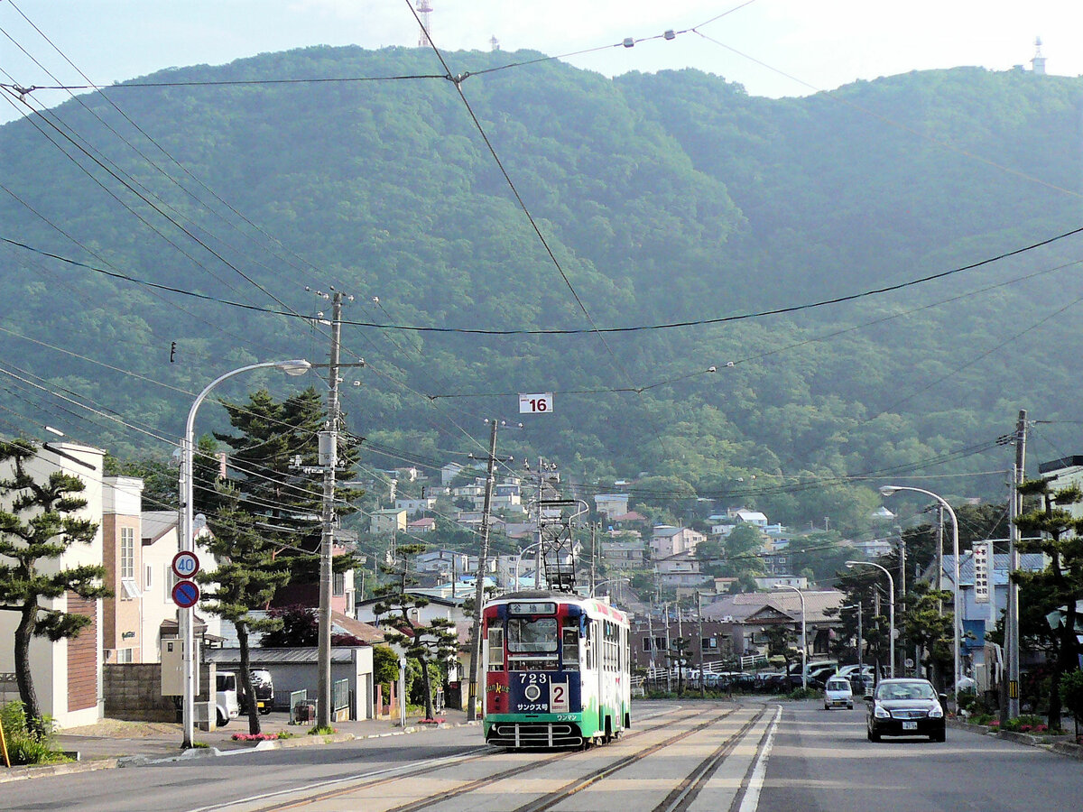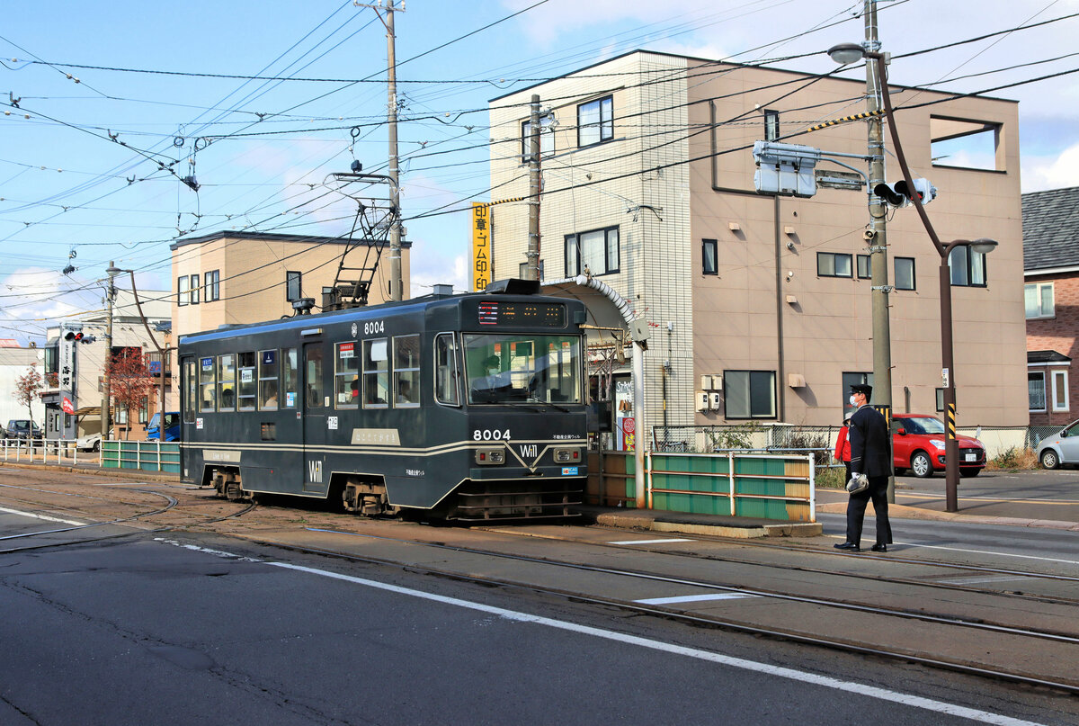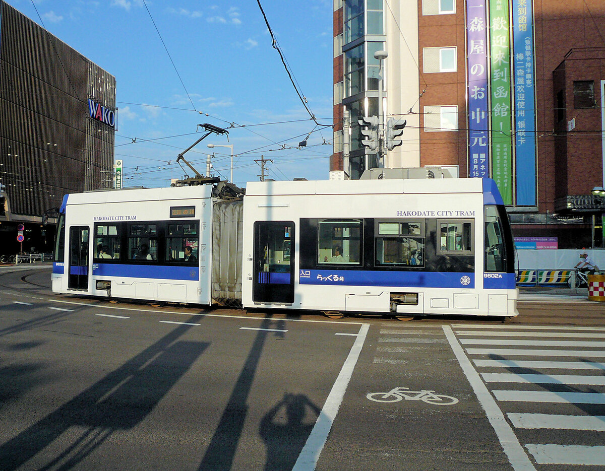 Strassenbahn Hakodate im Süden der Insel Hokkaidô, Japan: Die 4 neusten Wagen sind kurze Gelenkwagen mit Niederflureinstieg, 9601 von 2007, 9602 von 2010, 9603 von 2014 und 9604 aus dem Jahre 2018. Hier wird die damals gerade neue 9602 im Betriebshof gereinigt. 6.Juli 2010.