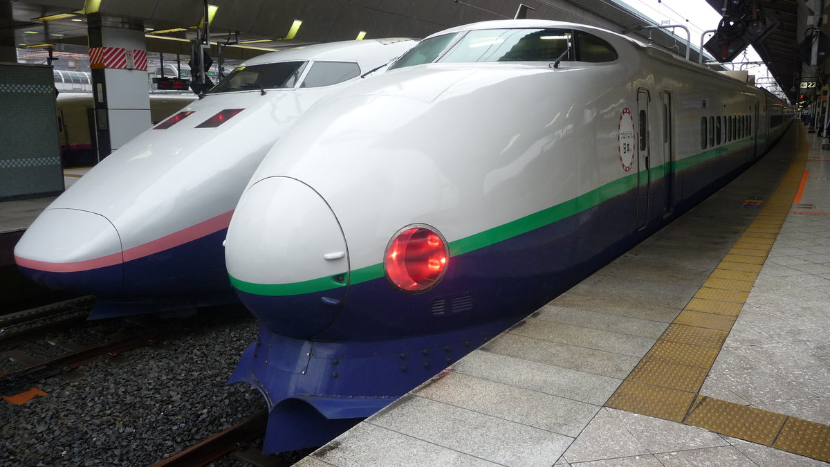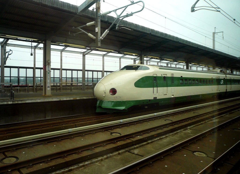Shinkansen Serie 200: Ab 1980 700 Wagen für die 1983 eröffneten Tôhoku-Shinkansen (nach Nordosten) und Jôetsu-Shinkansen (von Tokyo nach Norden ans Japanische Meer) gebaut. Zwischen 8- und 16-Wagenzüge (Wagengruppen immer wieder neu arrangiert). Es gab bis 2004 auch 12 Doppelstockwagen. Ab 1997 ausgemustert; heute noch 11 10-Wagenzüge vorhanden. Ein Zug 2004 bei einem schweren Erdbeben in der Nähe von Nagaoka entgleist (der einzige nennenswerte Shinkansen-Unfall bis heute). Im Bild steht Zug mit Endwagen 222-33 in Morioka, 3.September 1983.