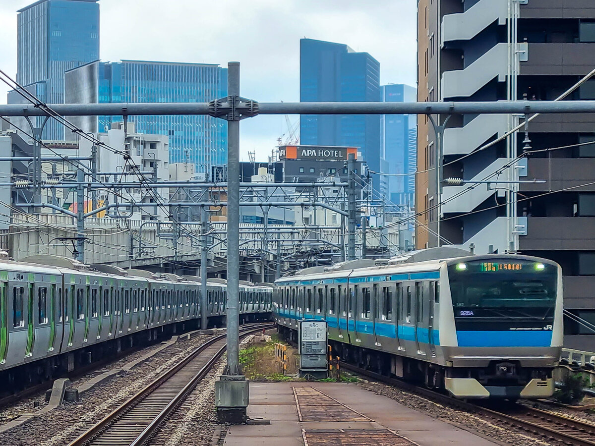 Monströse Gebäude in Tokyo: Immer mehr Menschen wohnen in sog. Tower Mansions, also "Turm-Wohnblocks", wie hier in Musashi Kosugi ausserhalb von Tokyo. Einfahrt des Zuges 233-8022 des Nambu-Linie. 25.April 2022 Peter Ackermann