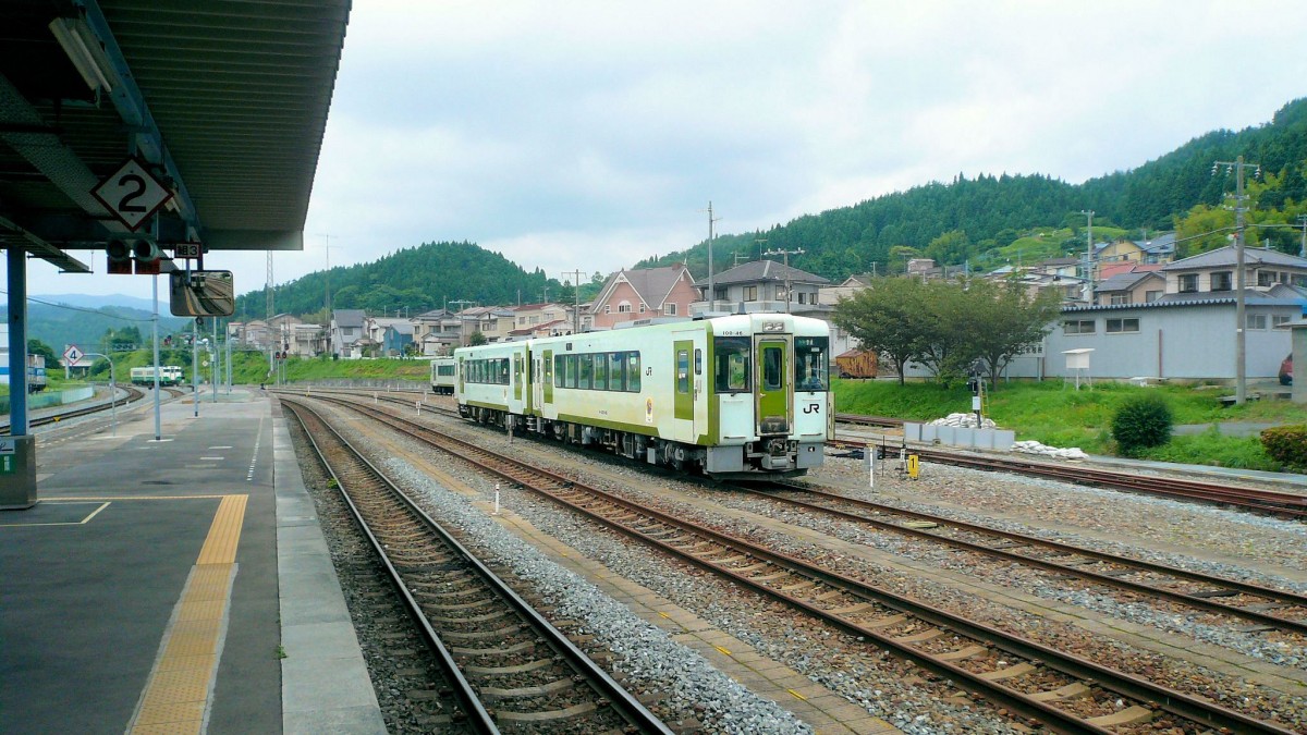 Ôfunato-Linie, Kesennuma: Ein Bild aus besseren Zeiten, mit Zügen von der Bergstrecke und von der jetzt vollständig zerstörten Küstenstrecke her. Im Hintergrund links ein Zug der praktisch ebenfalls völlig zerstörten Kesennuma-Linie. Die Ôfunato-Linie wird mit kleinen Triebwagen Serie 100 betrieben, im Bild das Triebwagenpaar KIHA 100-46 und KIHA 100-2. 9.Juli 2010. Peter Ackermann