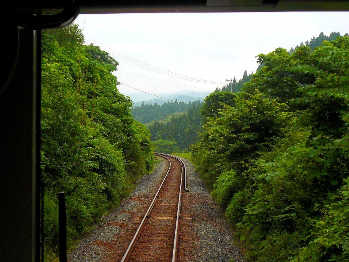 Eine Fahrt auf der Ôfunato-Linie bringt nach jeder Kurve überraschende Blicke in eine weitgehend unberührte Natur. Im Triebwagen KIHA 100-42 beim Abstieg an die Pazifikküste. Nach Mataki, 9.Juli 2010. Peter Ackermann