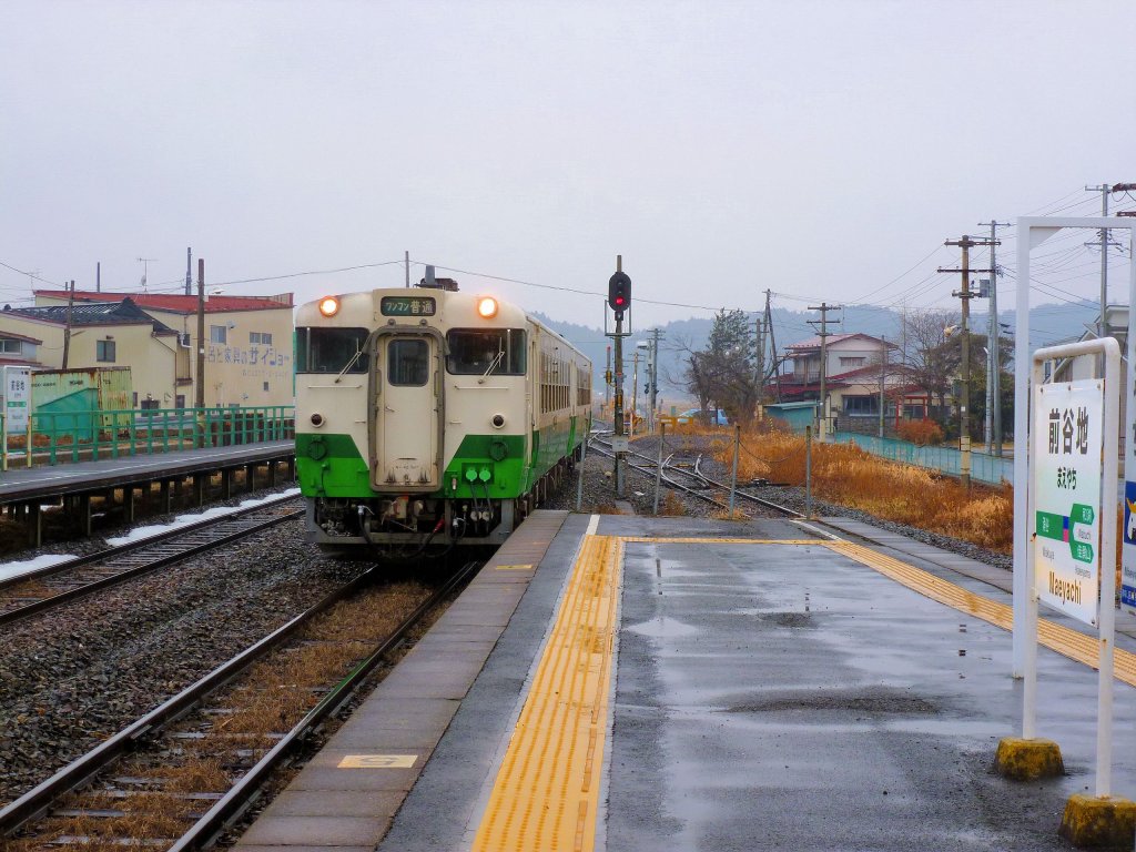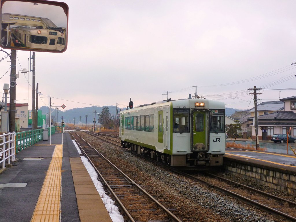 Kesennuma-Linie: So etwa könnte die gesamte Strecke aussehen, wäre sie nicht weitgehend vom Tsunami zerstört; typische relativ gerade Neubaustrecke der späten 1960er/1970er Jahre mit vielen Tunnels und Brücken. Blick aus dem Rückfenster eines Zuges auf den verbliebenen, noch befahrbaren 17,5 km (von 72,8 km) im Inland bei Yanaizu, 15.Februar 2013.
