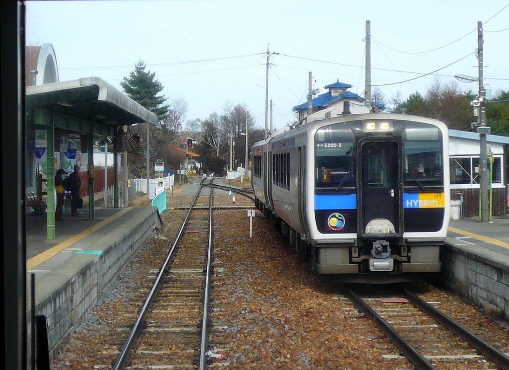 Hybrid-Triebwagen KIHA E200 (キハE200): Im Sommer 2007 wurden 3 Prototypen (KIHA E200) eines Triebwagens in Dienst gestellt, deren Motoren beim Anfahren von einer Batterie (auf dem Dach) gespeist werden, die beim Beschleunigen Dieselmotor+Batterie benutzen, und beim Bremsen die Batterie aufladen. Dadurch konnten die Schadstoffe gegenüber den anderen Triebwagen um 60% reduziert und auch der Brennstoffverbrauch erheblich reduziert werden; auch kein Leerlaufen des Motors (Geräuschreduktion!). Die Wagen sind nach wie vor als Dieseltriebwagen mit gewöhnlichen Sitzplätzen (KI-HA) bezeichnet; E steht für "JR East Japan". Im Bild der KIHA E200 Nr.2, 24.November 2009.
