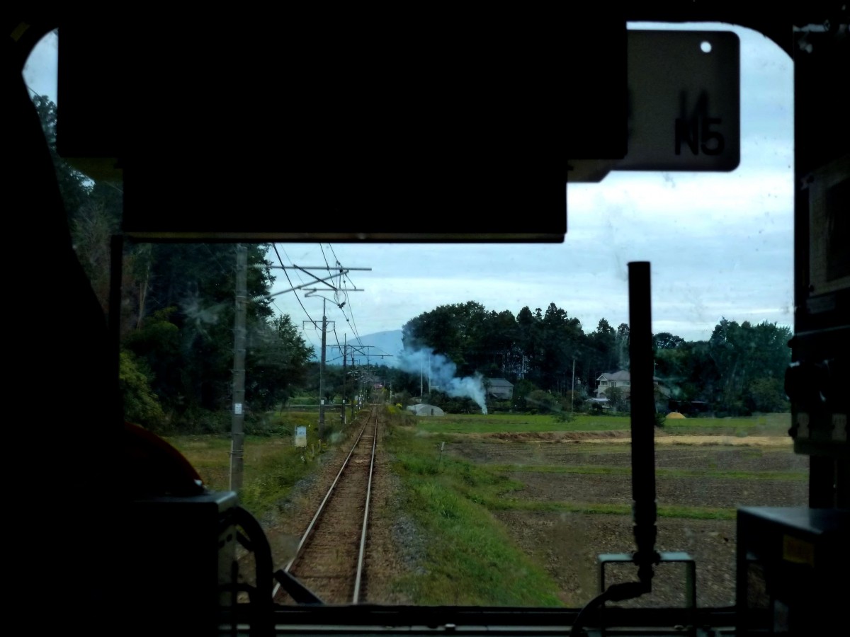In der Heimat der Serie 107 (Nikkô-Linie): Ankunft in Imaichi, wo der Gegenzug 107-2 wartet. Blick durch die verglaste Führerstandrückwand; leider sind die Frontscheiben extrem verschmutzt (Vögel, Regentropfen). 21.Oktober 2011.