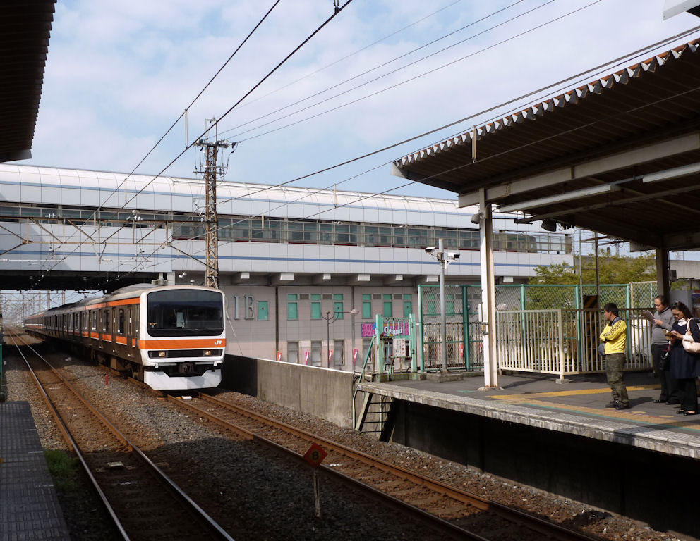 Serie 209-500: Im Stadtkern von Tokyo kurz vor Iidabashi kommt ein Zug der Serie 209-500 von der Stadt Chiba her entgegen. 13.Oktober 2011. (Aufnahme durch die verglaste Führerstandrückwand eines Gegenzugs) CHÛÔ-SÔBU-LINIE