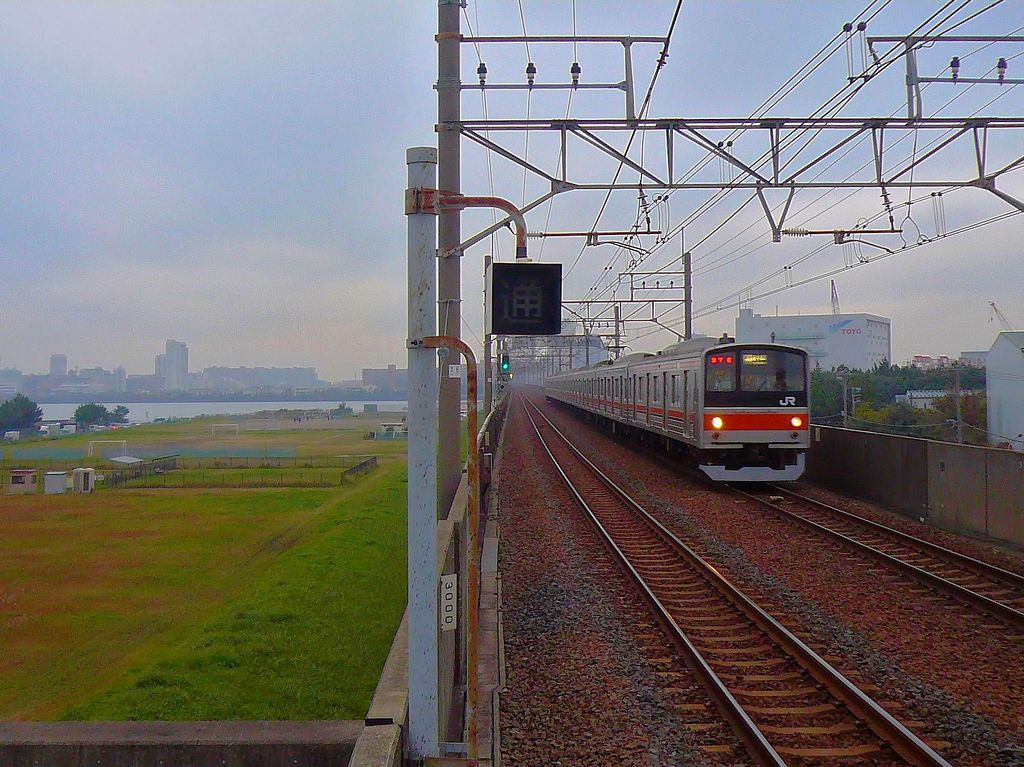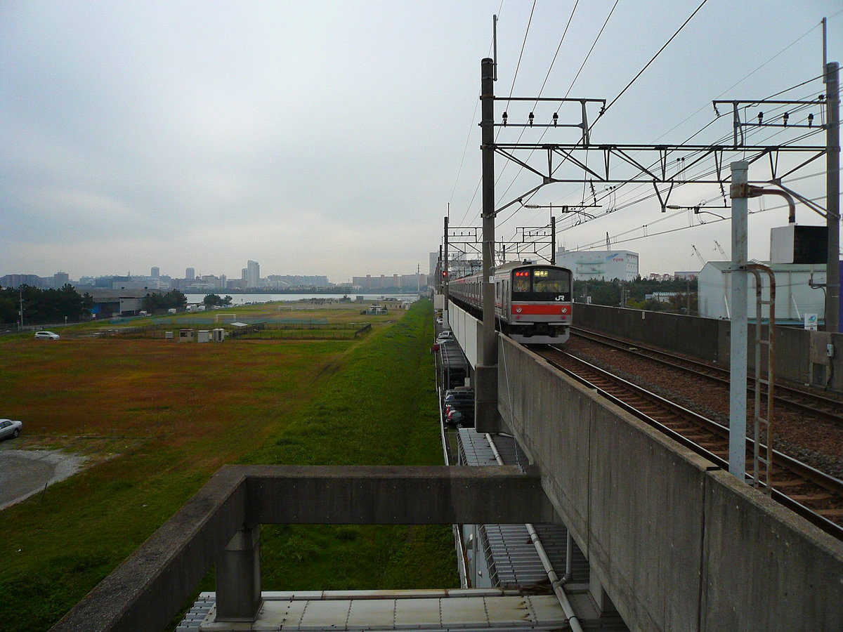 Serie 205, Keiyô-Linie: Einfahrt eines der ältesten Züge Serie 205 (ursprünglich auf der Yamanote-Ringbahn eingesetzt und noch mit zweiteiligen Fenstern) in Ichikawa Shiohama. Im Bild der hintere Steuerwagen KUHA 204-2. 22.November 2009.
