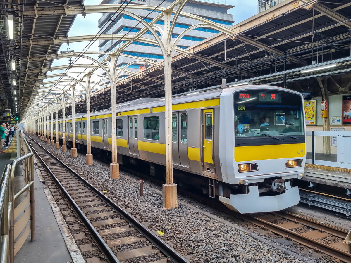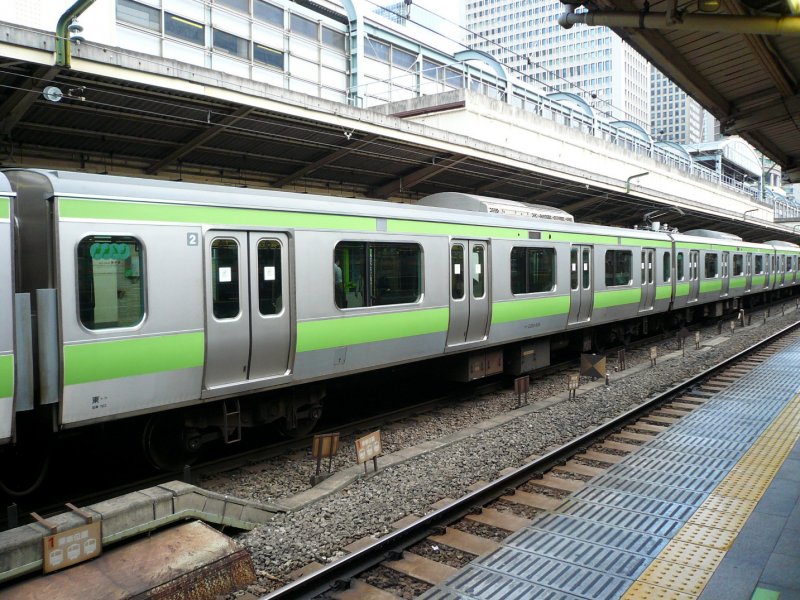 E231-500 Series Zug der JR East auf der Yamanote-Linie bei der Einfahrt in den Bahnhof Harajuku am 12.11.2010. Der Bahnhof ist der Zugang zum Stadtteil zur "Takeshita-dōri", einer bekannten Einkaufsstrasse, in der vor allem Cosplay- aber auch andere Mode-Trends verkauft werden und die als Jungend-Mode-Zentrum Japans gilt.