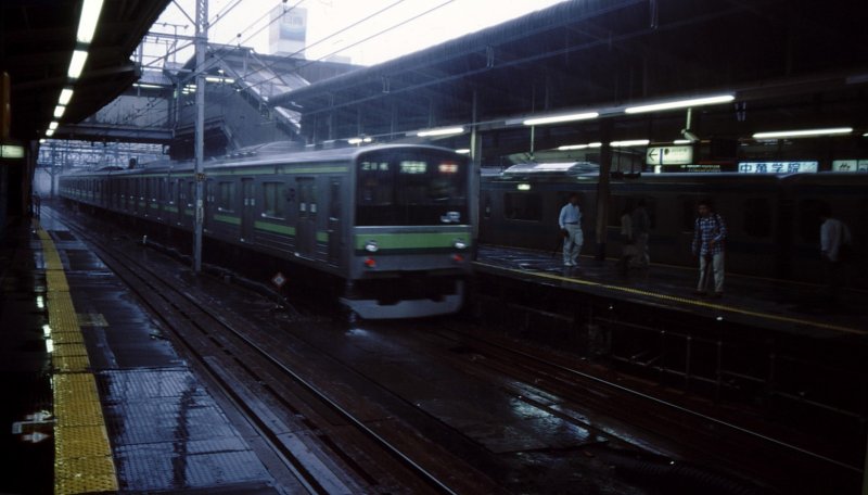 Serie 205: Ein Taifun-Tag an der Yokohama-Linie: Heftiger Regen hat eingesetzt, es ist düster, drückend-schwül und stickig-heiss in Yokohama, als der Zug mit KU-HA 204-70 an der Spitze einfährt. 22.September 1996. YOKOHAMA-LINIE Peter Ackermann
