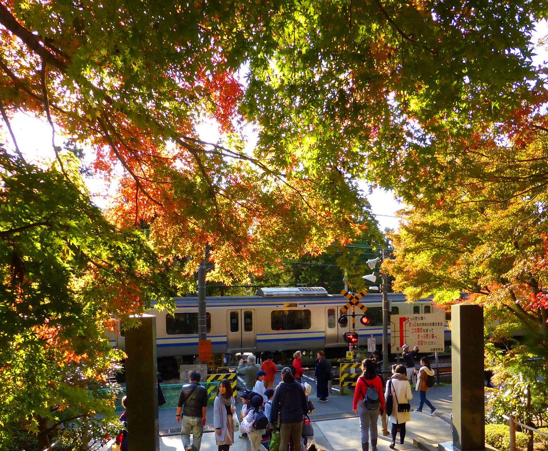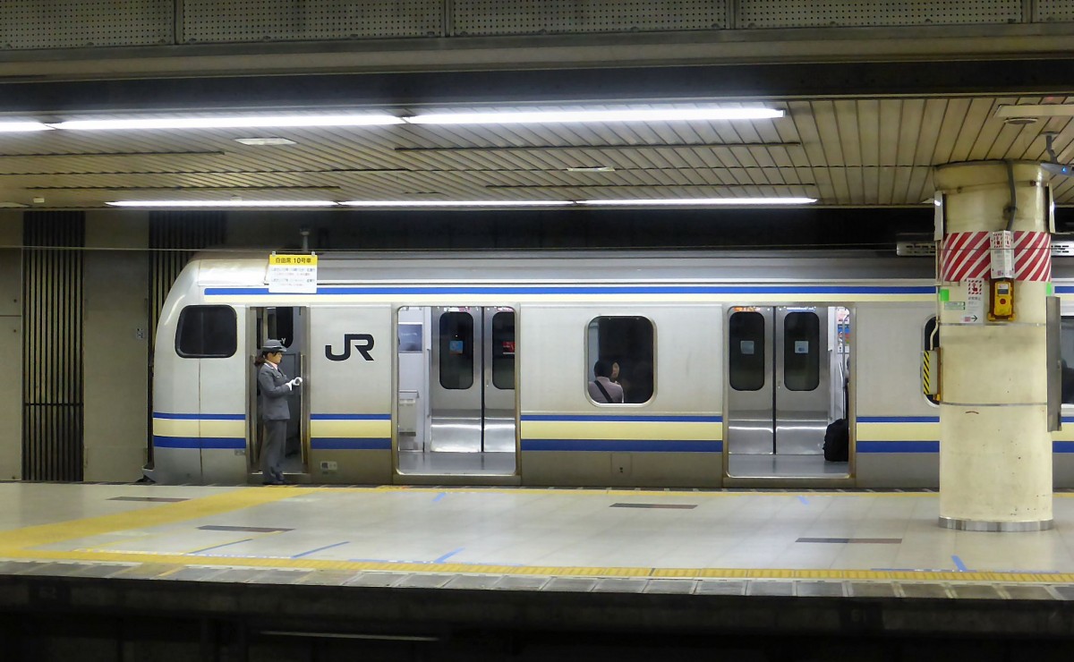 Kreuzung zweier Eilzüge Serie 217: Aufnahme durch die verglaste Führerstand-Rückwand von Zusatzzug Nr. 19 (als Y-119 an der Frontscheibe angeschrieben). Entgegen kommt Zug Nr. 46 (Frontwagen kuha217-46). An der Bucht von Tokyo bei Anegasaki, 17.Oktober 2014.