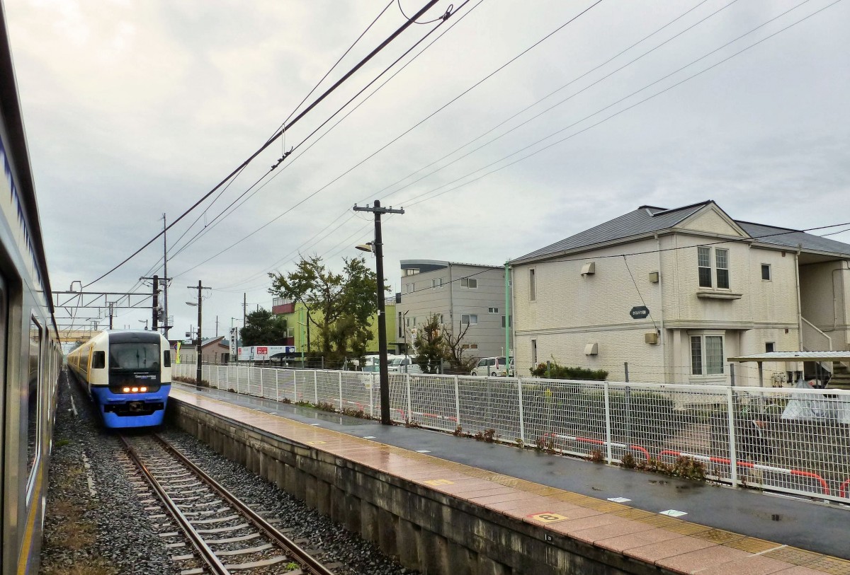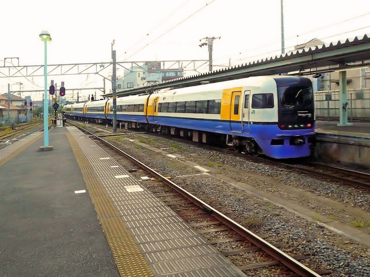 Serie 255: 1993/94 wurden 5 derartige 9-Wagenzüge (Gleichstrom) gebaut für hochwertige Dienste von Tokyo aus nach Osten in die Hafenstadt Chôshi und auf die Chiba-Halbinsel (Bôsô-Halbinsel) hinaus. Sie tragen den tiefblau/gelben Anstrich der Intercity-Züge dieser Region, der an Sandstrände und das geheimnisvolle Meer erinnern soll. Alle stehen auch heute im Einsatz. Bild: Ausfahrt des Zuges 255-5 aus Chôshi, 1.Juli 2010. Peter Ackermann