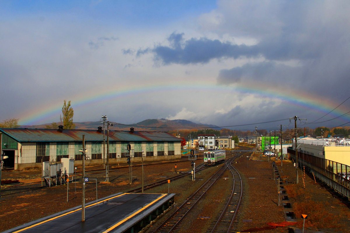 KIHA 150 (キハ150) von JR Hokkaidô: Die Furano-Linie von der Stadt Asahikawa ins zentrale Hochland wird gern von Touristen benutzt, wie hier Menschen aus China, Südkorea, Thailand, Malaysia und Indonesien. Die wilden Vulkanketten, das fruchtbare Ackerland und die Lavendelfelder sind eine Attraktion. Bild: Die Wagen KIHA 150-10 und 150-8 in Biei, 27.Juli 2016. FURANO-LINIE