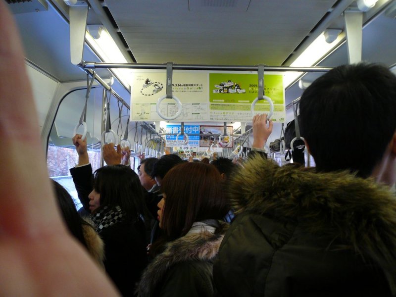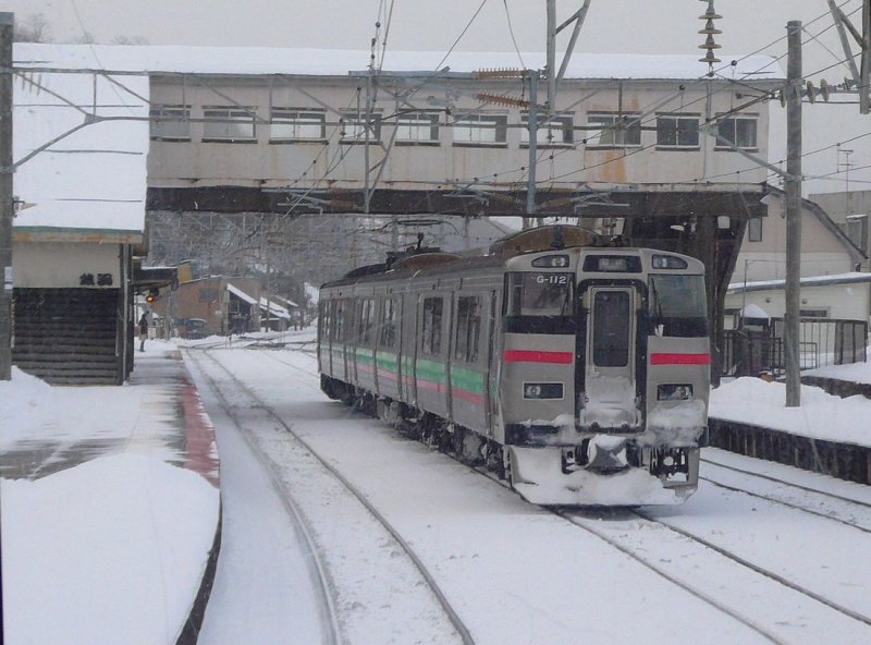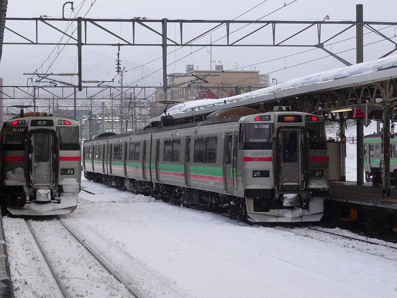 JR Serie 731: An einem eisigen Morgen braust Zug 731-103 Richtung Sapporo; bei Shinrin Kôen, 17.Februar 2009. Aufnahme durch die verglaste Führerstand-Rückwand. S-BAHN SAPPORO