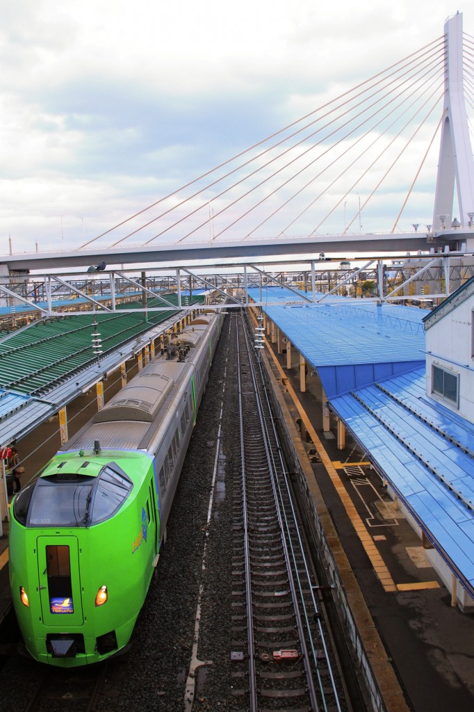 Serie 789 von JR-Hokkaidô, Zug 789-102 wartet in Aomori auf Abfahrt unter das Meer nach Hokkaidô. Daneben Regionalzug von JR-Ostjapan Nr.701-1, in Aomori am 12.Februar 2013. Bald gehören solche Szenen der Vergangenheit, und man braust dann mit dem Shinkansen direkt von Tokyo nach Hokkaidô.