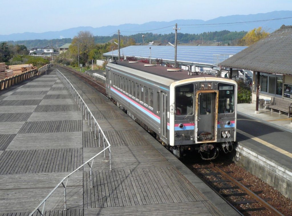 KIHA 31 11 ist in Tagawa Gotôji eingefahren, im ehemaligen Kohlerevier von Nordost-Kyûshû. Diese Gegend war lange sehr heruntergekommen, doch jetzt steht auf den Tafeln vor dem Triebwagen: "Der Gotôji-Bahnhof soll frei sein von Müll und voller Blumen - Industrie und Handelskammer Tagawa, Jugendgruppe. Wir schliessen uns den Bemühungen an, Tagawa zum schönsten und vitalsten Bezirk Japans zu machen". 25.Juli 2013. GOTÔJI-LINIE