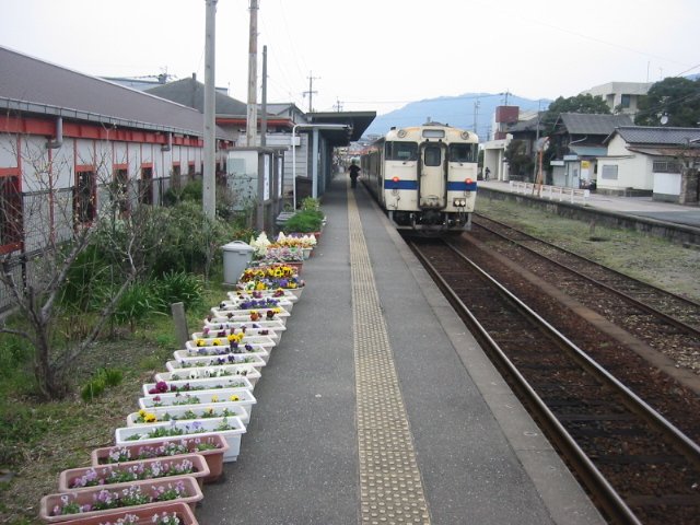 Die südlichere der beiden Transversallinien (offizieller Name: Hôhi-Hauptlinie) quer über die Insel Kyûshû: Ein älterer Triebzug aus den späten 70er Jahren wartet in Bungo Taketa unterhalb einer der Tempelanlagen auf die abendliche Stosszeit. Wagen KIHA 47 3509 und KIHA 47 4510. 1.Mai 2016. HÔHI-HAUPTLINIE
